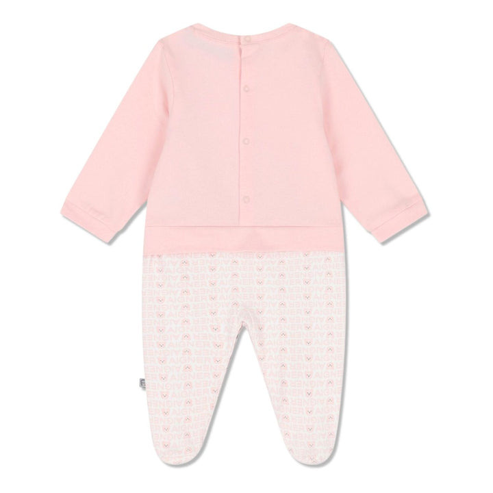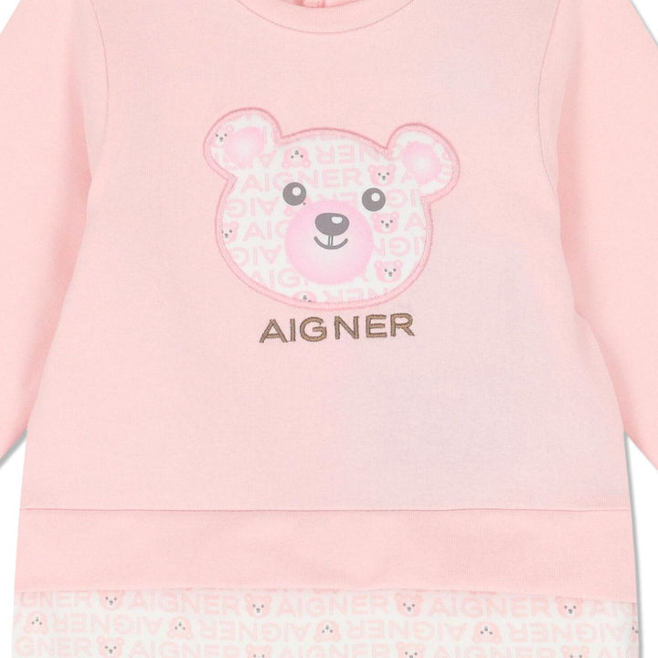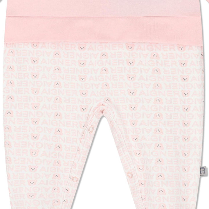 White and pink logo teddy bear babygrow for baby girls by Aigner. Made from soft cotton jersey for comfort. The front has a cute teddy bear face applique and embroidered logo, while the white bottom is patterned with a repeated pink brands name and teddy bear face print. It fastens with poppers at the back and between the legs for easy dressing. Matching items are available to purchase separately.