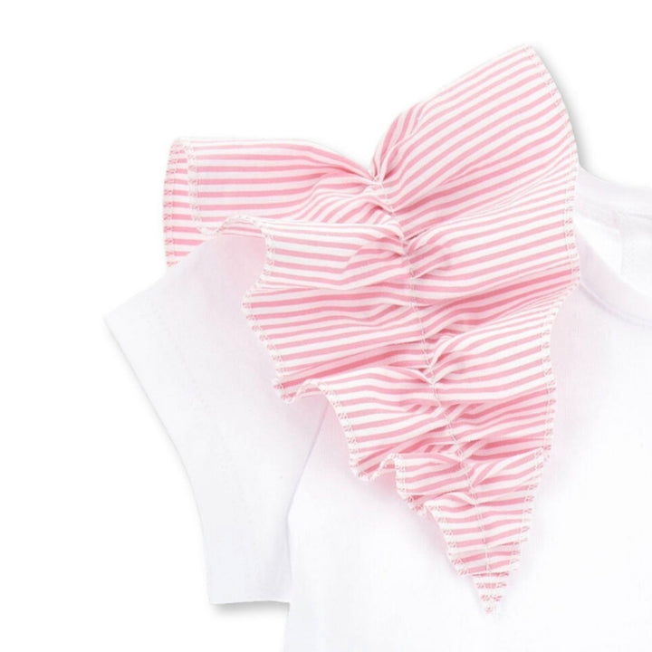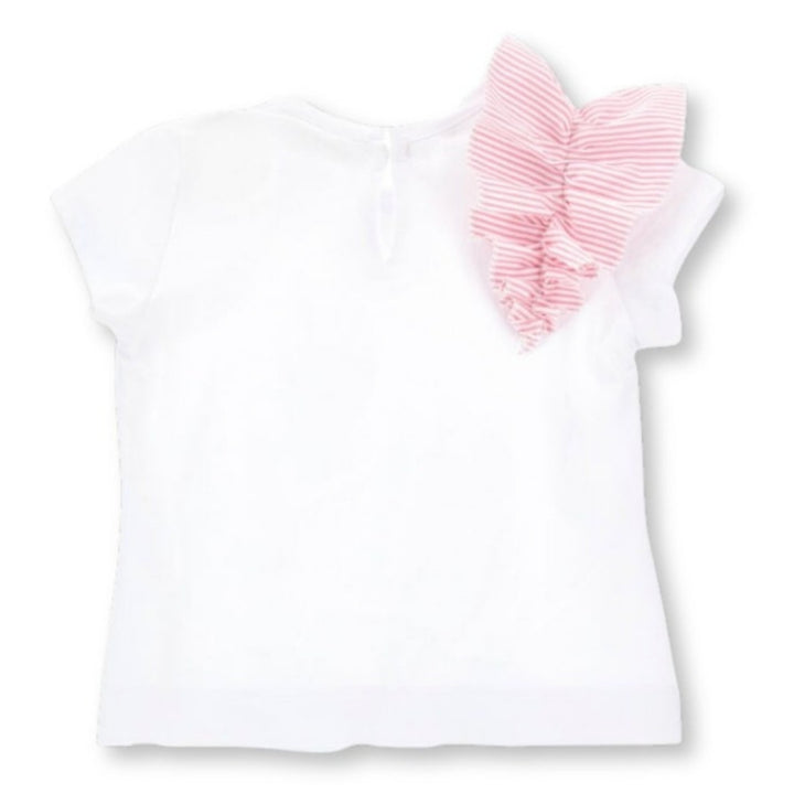 The classic T-shirt is made precious by a more sustainable yarn, asymmetrical ruffle and rhinestone logo.