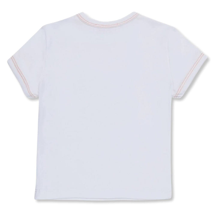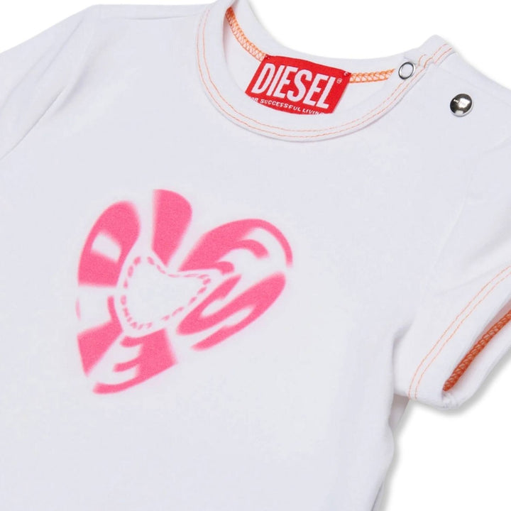 Diesel baby girls white T-shirt featuring a signature logo patch. Made from a soft, stretchy blend of 93% cotton and 7% elastane for everyday comfort with a touch of style.