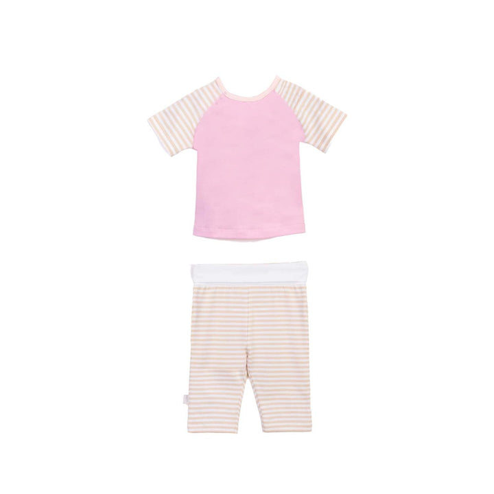 Sweet ivory and pink cotton jersey leggings set for baby girls by Sophie la Girafe. The pink top has a lovely print across the front with Sophie la Girafe printed. The pale stripped beige leggings have an embroidered Sophie la Girafe by the elasticat