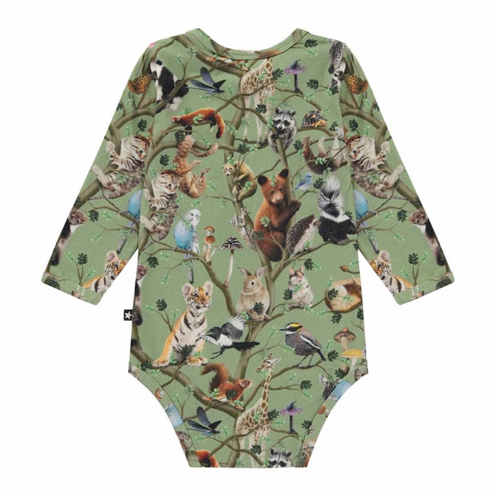 Green baby bodysuit in an all over print of animals in the Tree of Life. Just like the trees root system, all the mushrooms, birds, trees and bears, large and small, are linked together. Thats why we have to watch out for each other. This bodysuit is