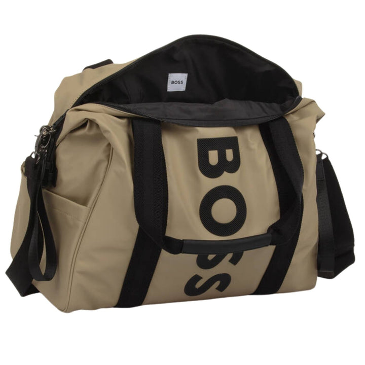 This beige changing bag by BOSS is inspired by the main collection and combines functionality with style. The smooth exterior features a large textured rubberised logo and has practical elements such as sturdy webbed handles, detachable stroller straps and an adjustable shoulder strap. The spacious interior has multiple mesh pockets and fastens securely with a zip, with additional external pockets for extra storage.