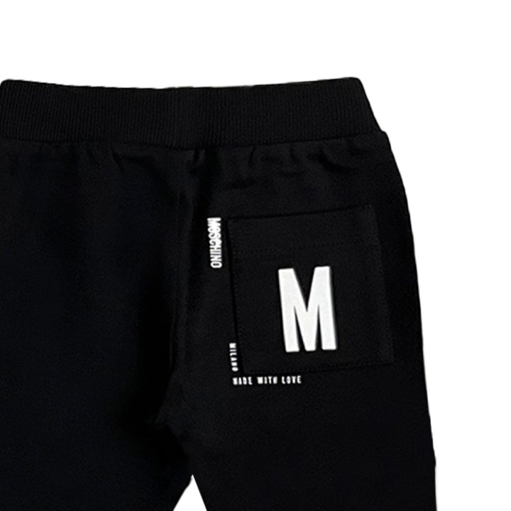 A cool black tracksuit for baby boys and girls by Moschino Kid-Teen, inspired by the adult collection. Made in comfortable cotton jersey, the sweatshirt has a white 'M' logo printed on the chest pocket with a slogan that reads 'Milano Made With Love'