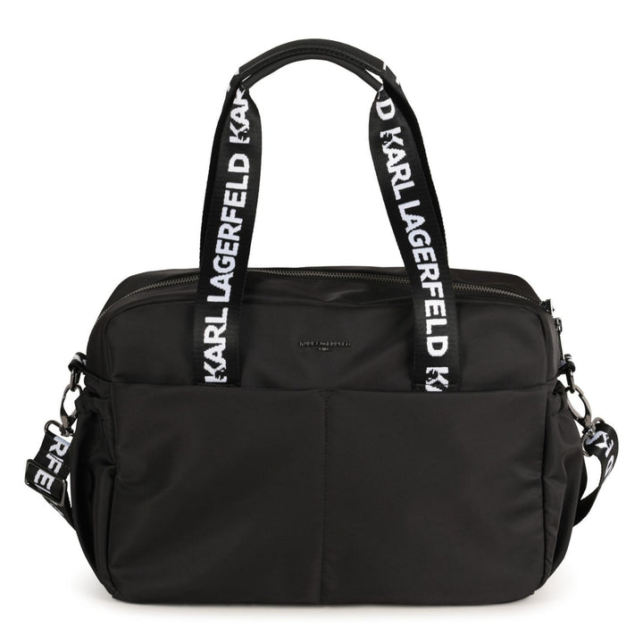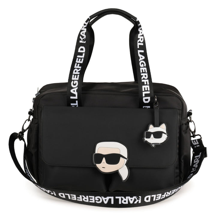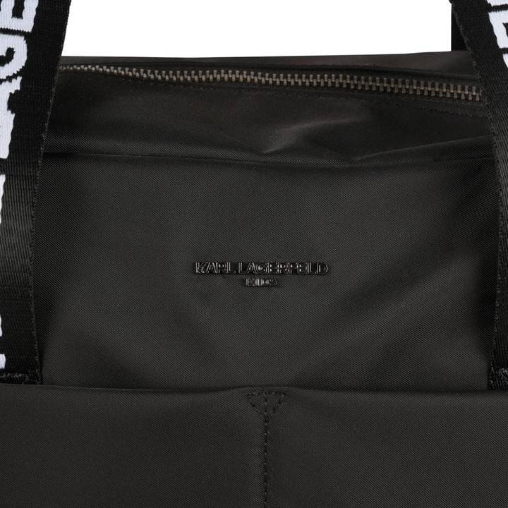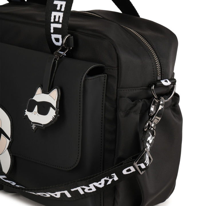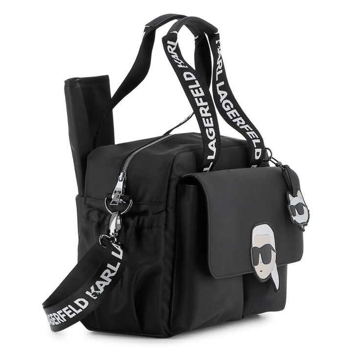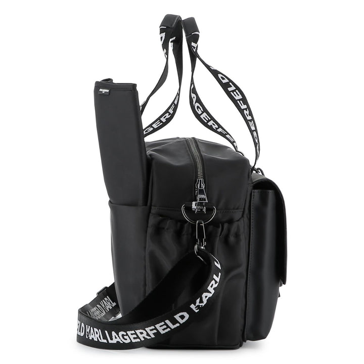 Stylish black changing bag for baby boys and girls by Karl Lagerfeld, featuring logo-strip detailing and multiple compartments for everyday convenience.