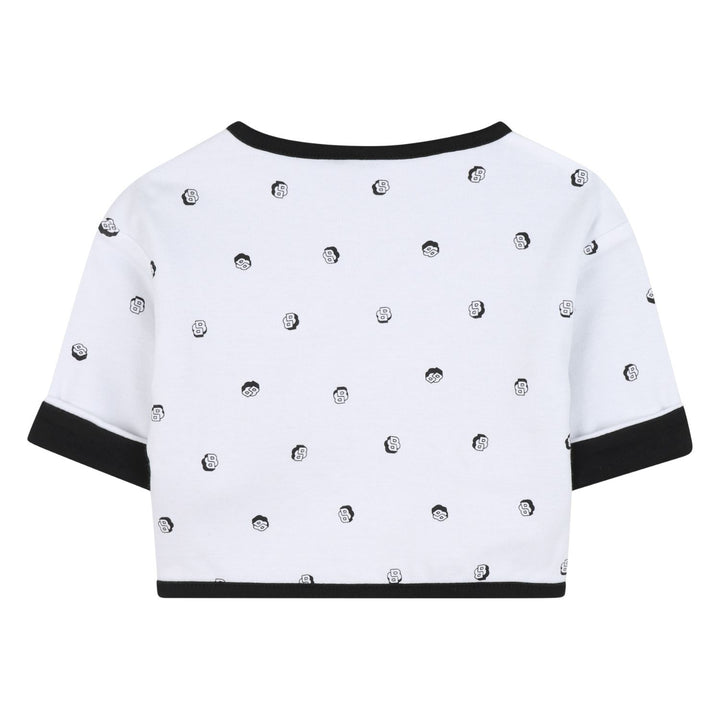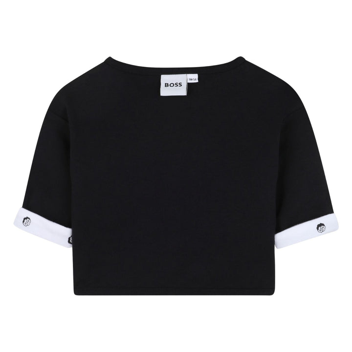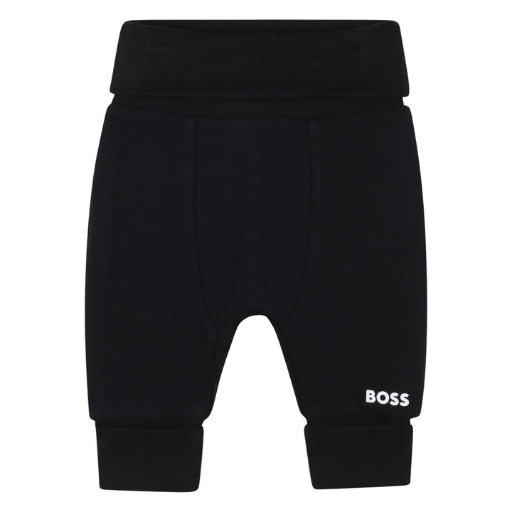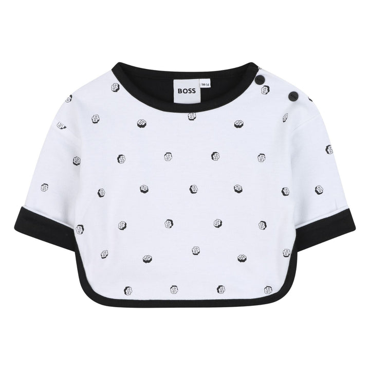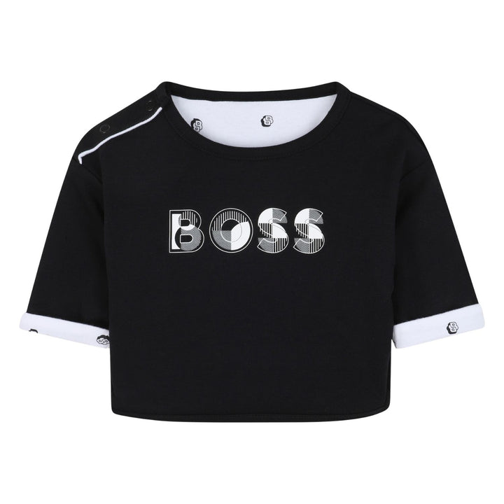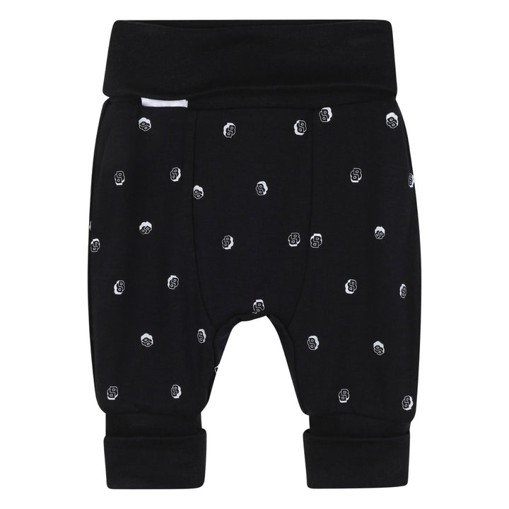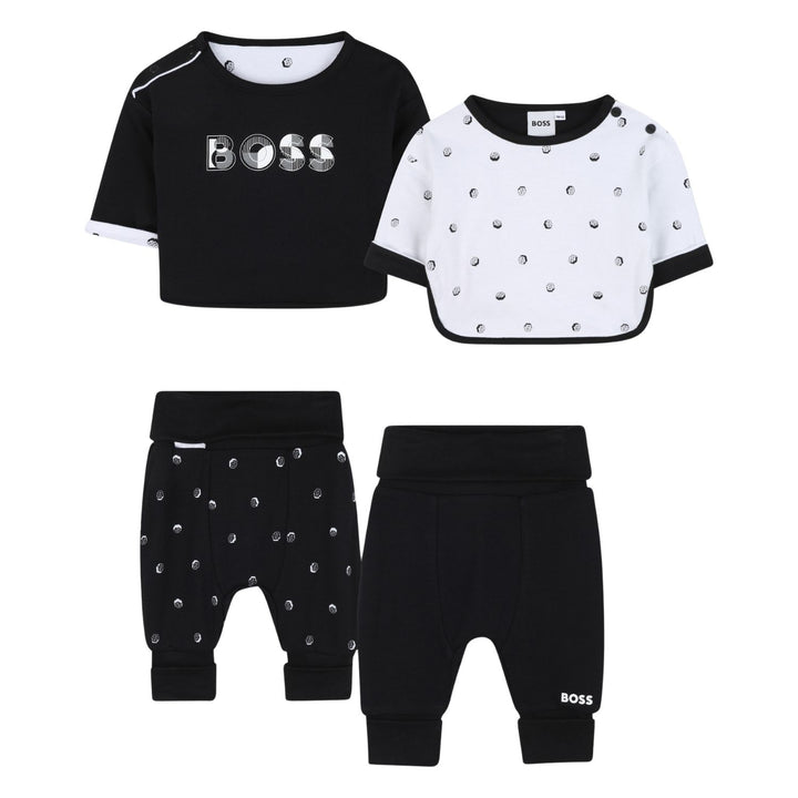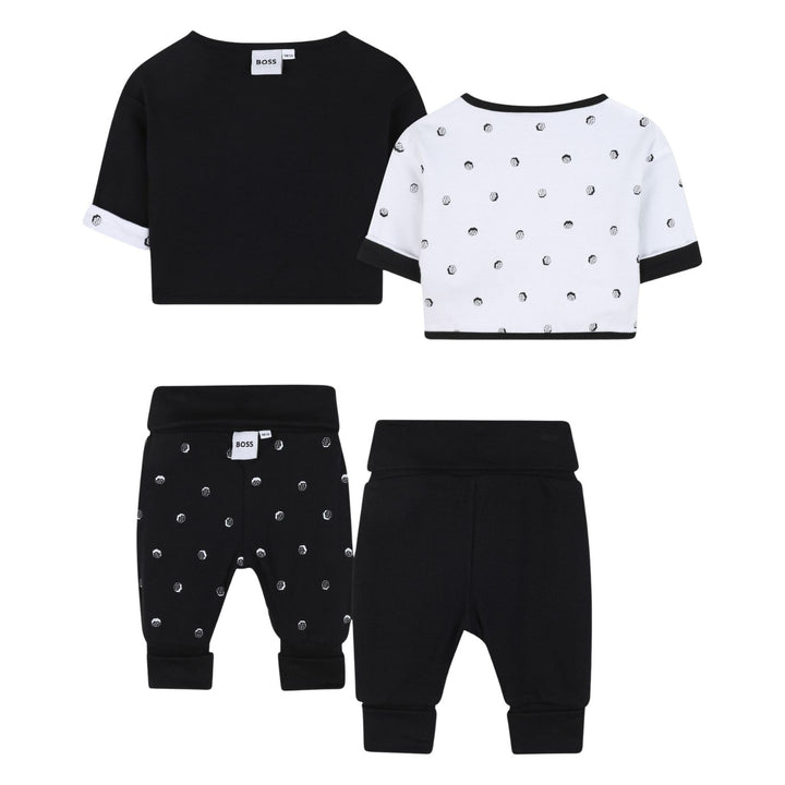 his reversible outfit set from BOSS includes two long sleeve tops and two pairs of matching bottoms for versatile styling. One top is black with a geometric BOSS logo in white and patterned interior, while the reversible side is white with a black dotted pattern and black trim. The two pairs of pants complement the tops with one featuring the same dotted pattern and the other in solid black with the logo embroidered near the ankle. Crafted from soft, comfortable fabric, this set offers easy outfit options with a stylish, modern look perfect for everyday wear.