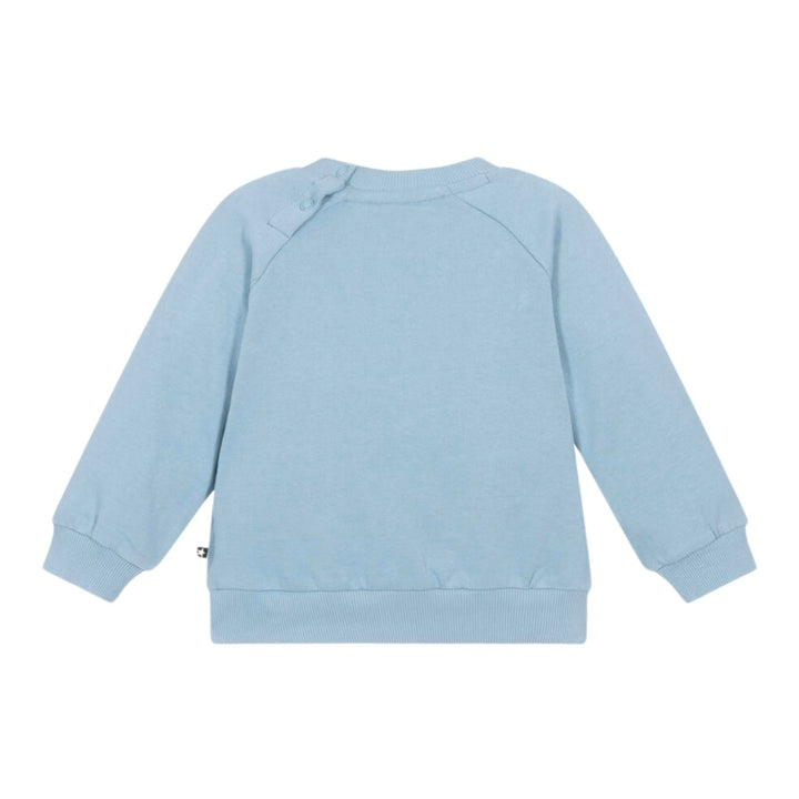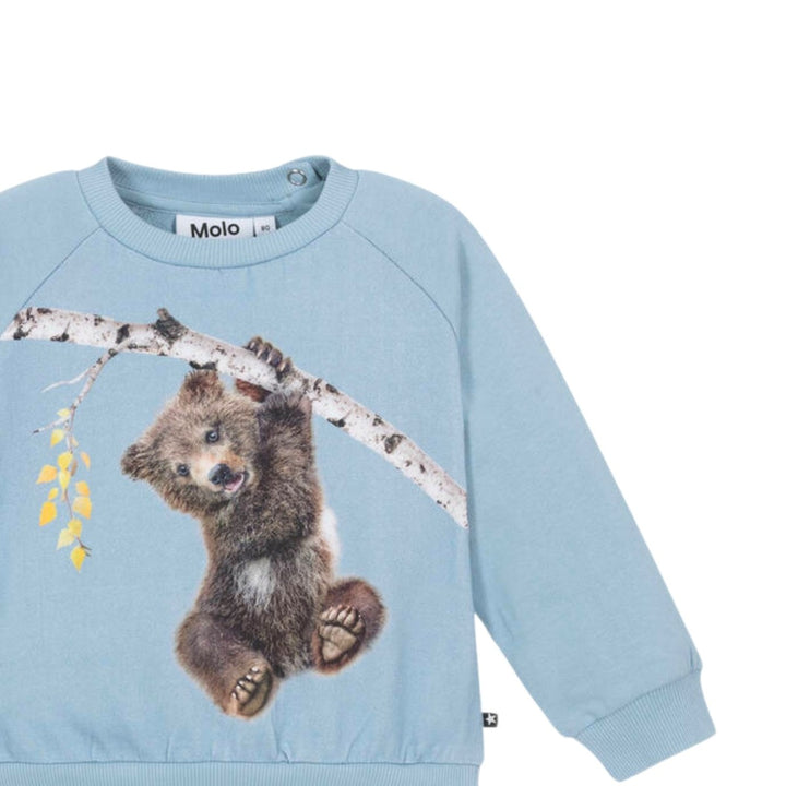 Pale blue sweatshirt for little boys and girls by Danish brand Molo, with an adorable brown bear cub on the front. Casual and comfortable, it is made in soft organic cotton jersey with ribbed trims. There are raglan sleeves for easy movement, fastening with poppers on the back to help with dressing. A small logo tab on the side seam adds a finishing designer touch.