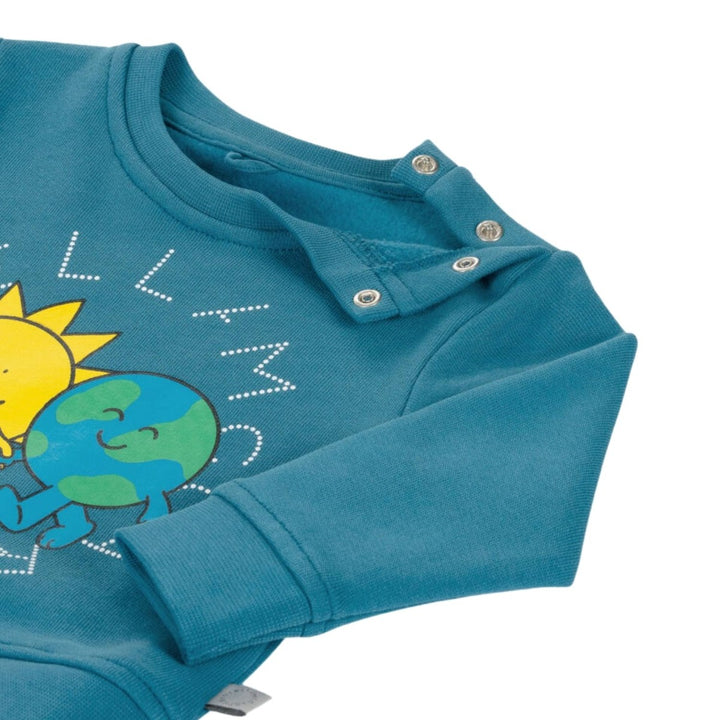 A playful blue organic cotton sweatshirt for little boys and girls by Stella McCartney Kids. Made in mid-weight jersey with a cosy fleecy inside, it has a cheerful sun and earth graphic on the front with a circular designer logo. Popper fastenings on the shoulder make it easy to slip on and off.