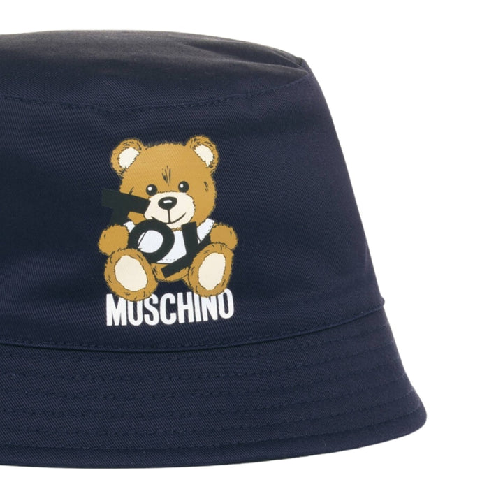 Adorable navy blue bucket hat for little boys and girls by Moschino, with the signature Teddy Bear logo on the front. This adorable sun hat is made in luxuriously soft cotton gabardine with a classic, stitched brim and a lightweight lining for comfort.
