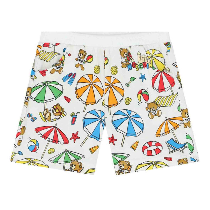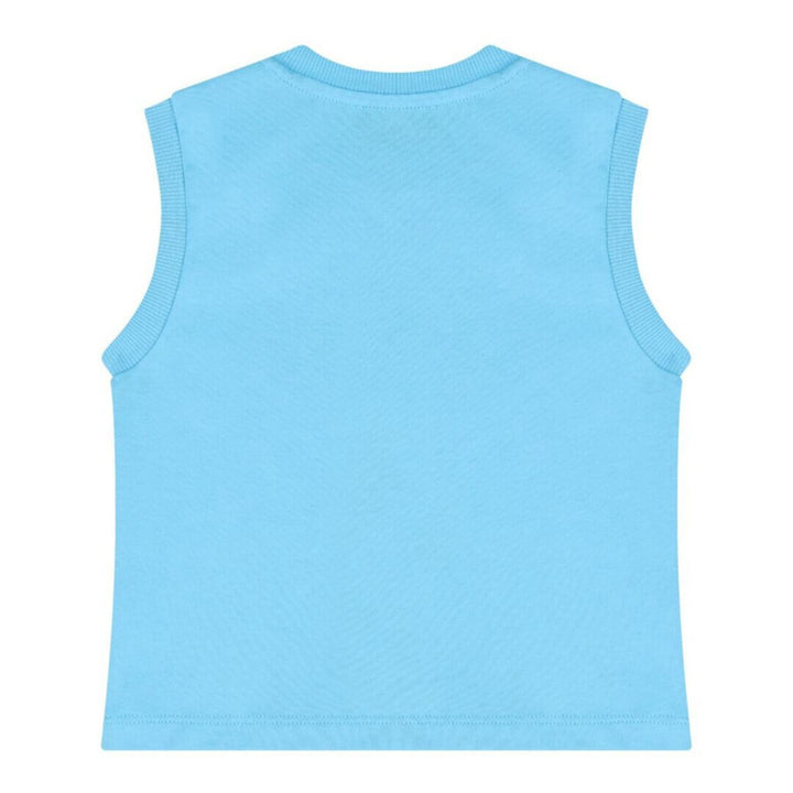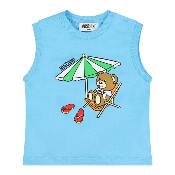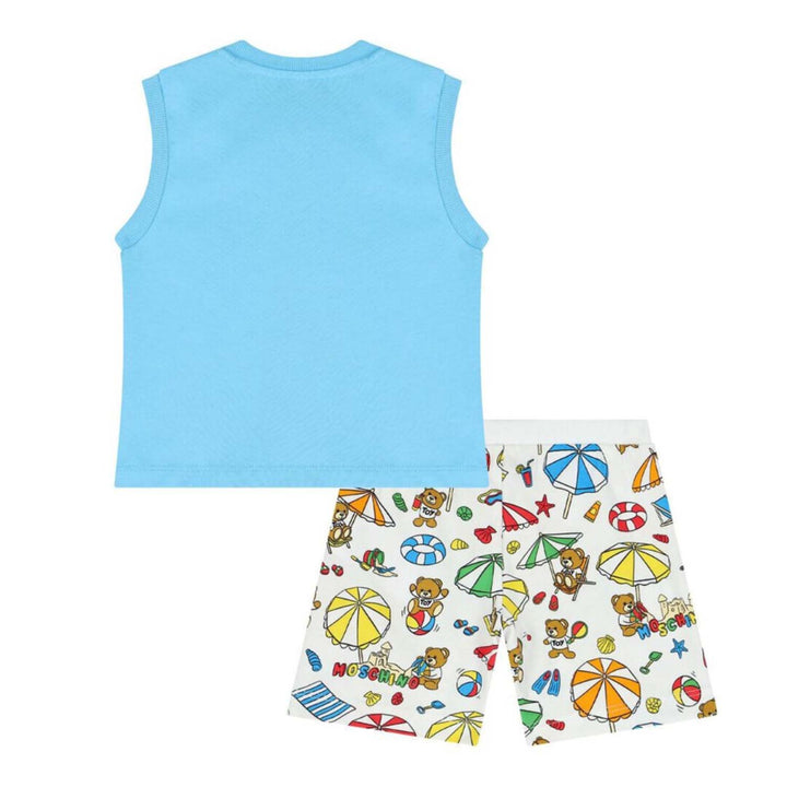 Unisex blue and white shorts set for baby boys and girls by Moschino. Made from soft premium cotton jersey, this set consists of blue sleeveless top with the brands iconic teddy bear under the umbrella and logo print on the front. Fastens with popper