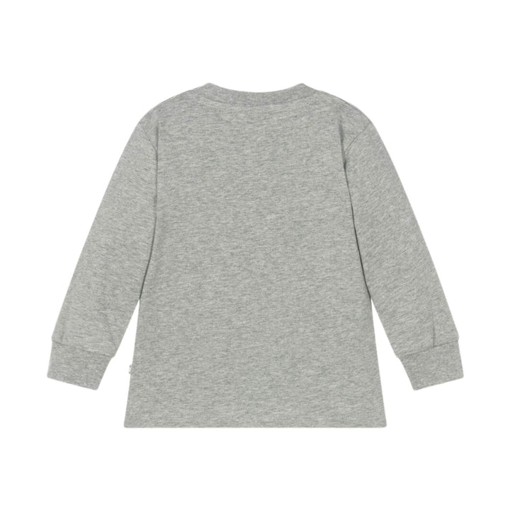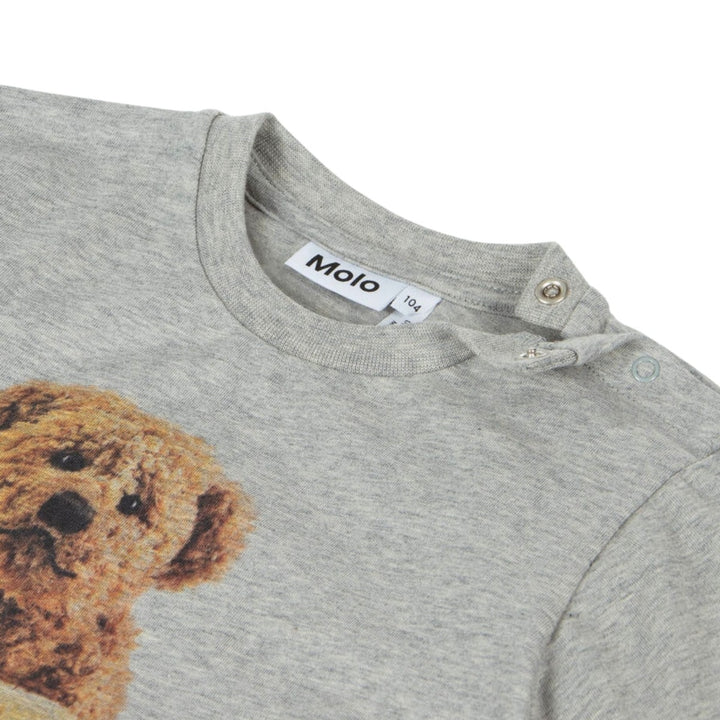 Grey marl t-shirt for little boys and girls by Danish brand Molo, with adorable furry teddy bears on the front. Casual and comfortable, it is made in soft organic cotton jersey, with a gently ribbed neckline and cuffs. There are easy-fastening poppers on one shoulder to help with dressing. A small logo tab on the side seam adds a finishing designer touch.