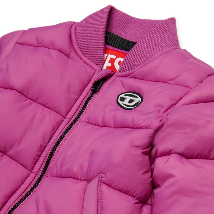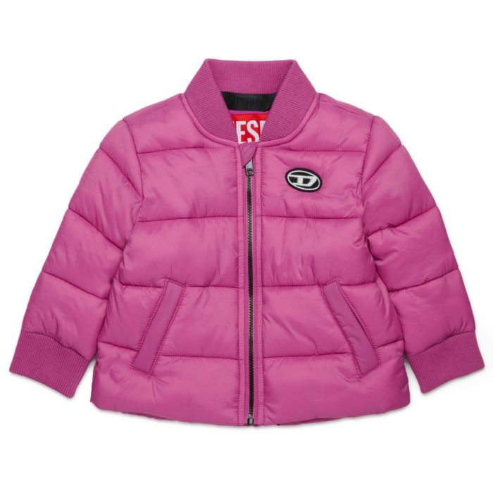 Unisex baby pink puffer jacket by Diesel, crafted from 100% nylon for a lightweight yet durable finish. Cozy, stylish, and perfect for keeping little ones warm in cooler weather.