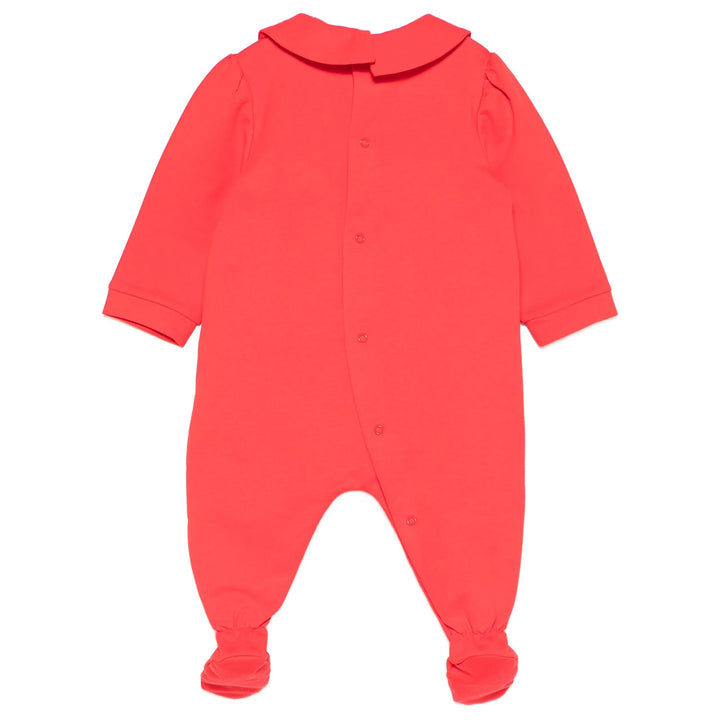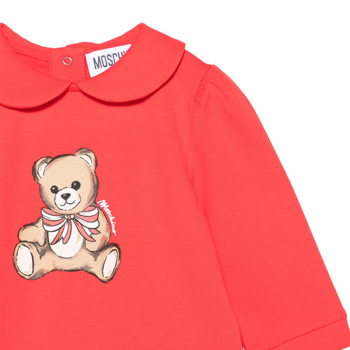 A vibrant red babygrow featuring Moschinos iconic teddy bear and logo print. Made from soft cotton jersey with ribbed trims and poppers for easy dressing.
