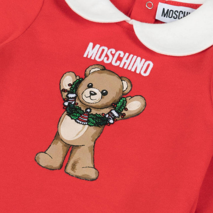 A soft cotton romper in vibrant red, featuring Moschinos iconic teddy bear embroidery. Comfortable and stylish, perfect for babies.