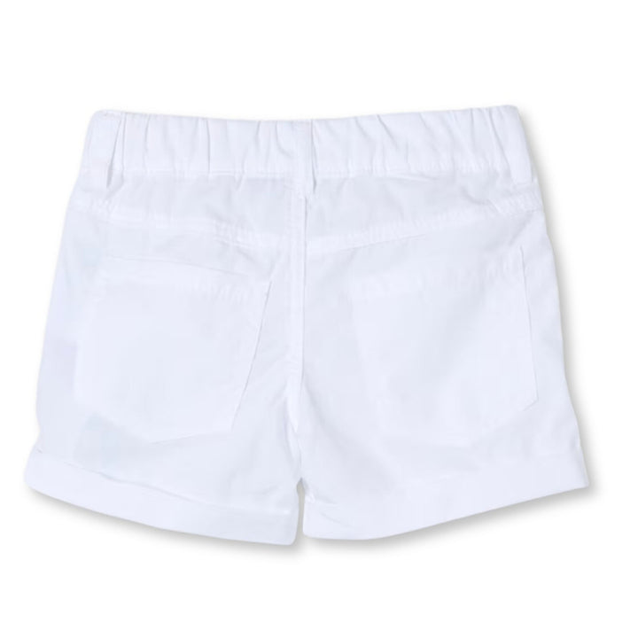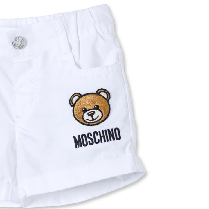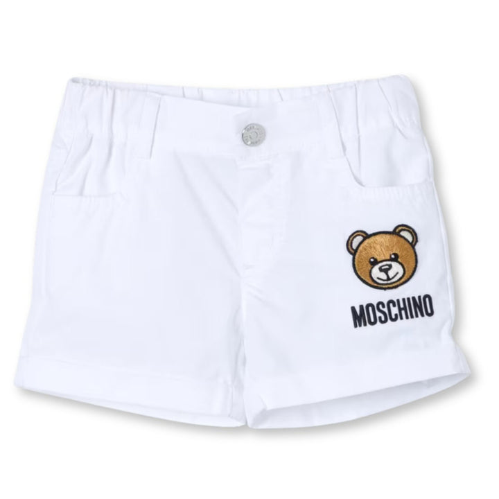 White teddy bear logo shorts for baby boys and girls by luxury Italian designer Moschino. Made from a soft cotton, they feature the embroidered brands iconic teddy bear and white logo on the front, have four pockets styling. Fasten with a branded but