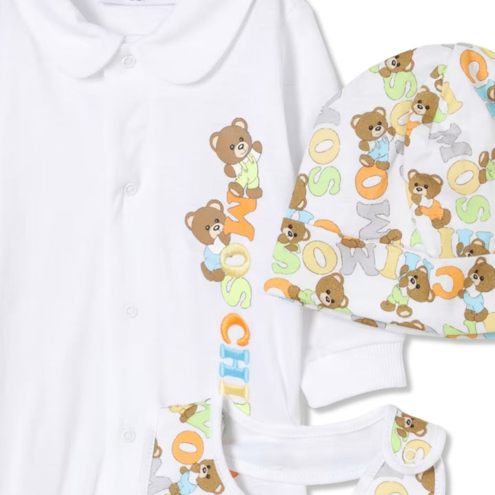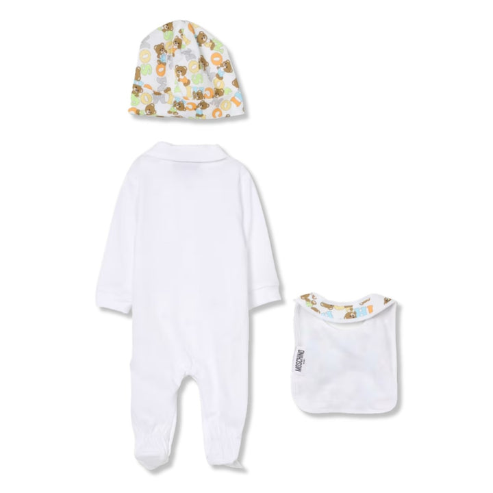 White Teddy-print pajama set with a front press-stud fastening, ribbed cuffs, covered feet, and an all-over logo print. Cozy and stylish for bedtime.