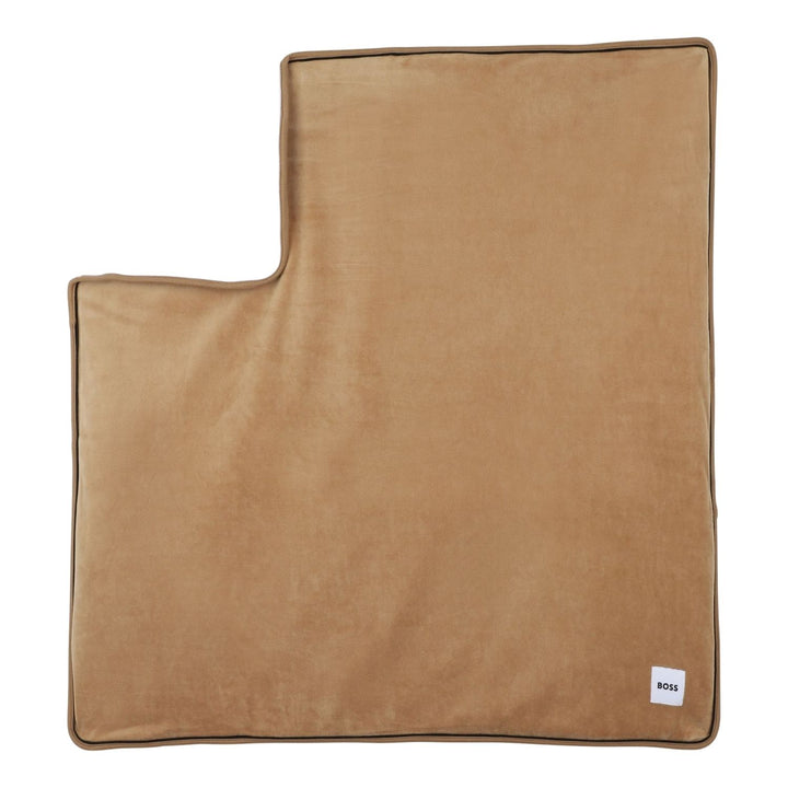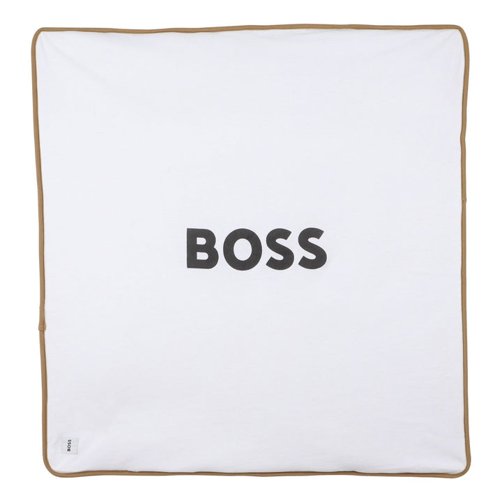 This BOSS baby blanket collection features a cozy reversible blanket set in warm tan and crisp white, each piece adorned with the iconic BOSS logo. The set includes versatile designs one with tan outer and white lining, another with a bold white surface and contrasting trim, and a matching roll-up blanket with handle for travel convenience. Crafted from soft, plush material, these blankets provide comfort and warmth, making them ideal for use in cribs, strollers, or for outings with little ones. Each item highlights modern branding and stylish finishing for a complete nursery accessory ensemble.