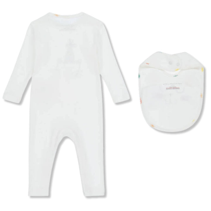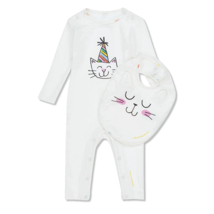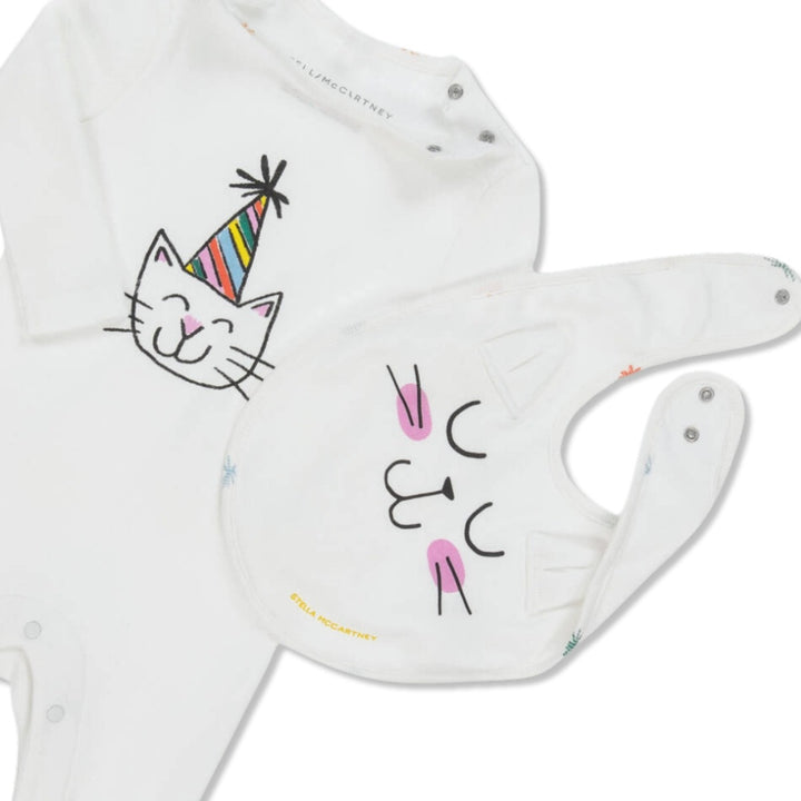 Off-white romper and bib set for baby boys and girls by Stella McCartney Kids, made in soft cotton jersey. Gentle against delicate skin, both pieces feature cute cat motifs and yellow logos. The romper has practical popper fastenings on the shoulders and between the legs for easy dressing, whilst the matching bib has fun 3D ears and adjustable popper fastenings on the back.