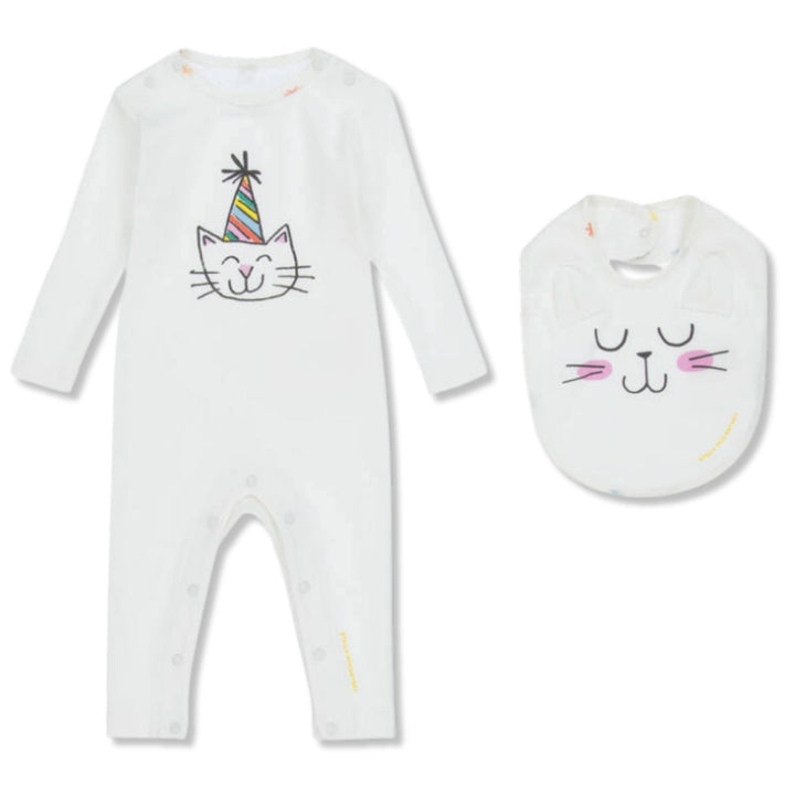 Baby Unisex White Cat Print Babysuit & Bib Set