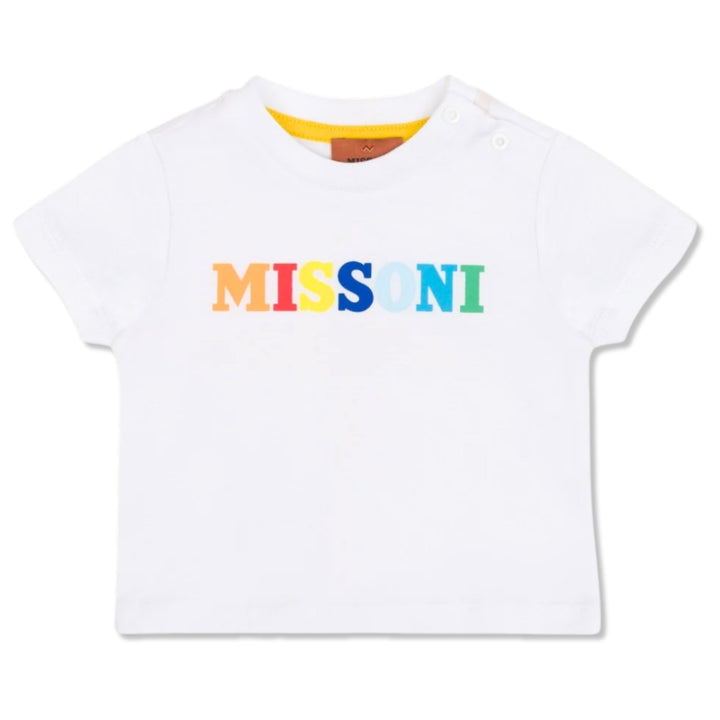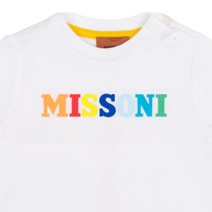 Brighten up your little one's wardrobe with the Missoni Baby unisex White Logo T-Shirt. This adorable short-sleeve tee features a classic crew neck and a soft cotton construction for all-day comfort. The standout detail is the Missoni logo in a vibrant rainbow gradient, adding a playful and stylish touch. Designed with snap buttons on the shoulder, this t-shirt ensures easy dressing for your baby.