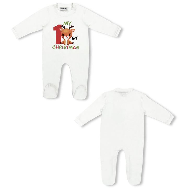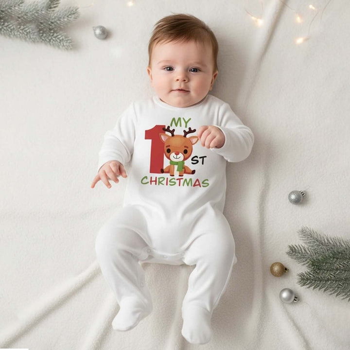 Baby Unisex White My First Christmas Print Rompers make the perfect outfit for celebrating a little one’s first festive season. Featuring an adorable Christmas print on a soft white fabric, this romper offers gentle comfort and easy movement. Ideal for holiday photos and family gatherings, it adds a sweet and memorable touch to baby’s first Christmas.