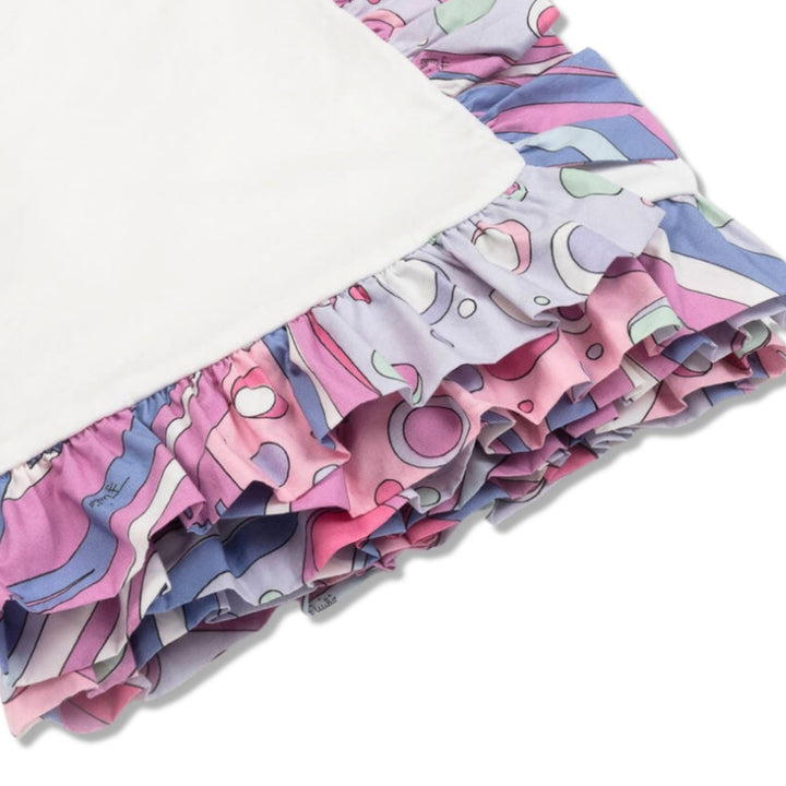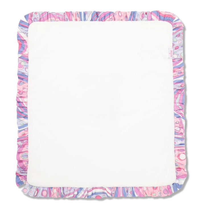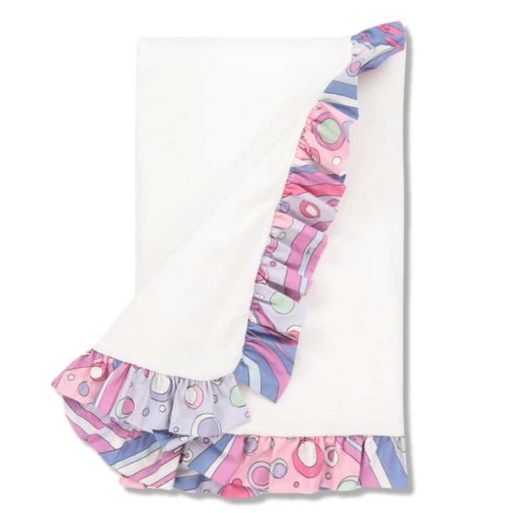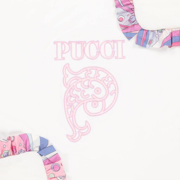 Beautiful white padded blanket for baby girls by PUCCI, with the Italian designer logo and fish motif embroidered in pink and lilac. Lightly padded for gentle comfort, the blanket is made in super soft cotton jersey. For added designer appeal, it has