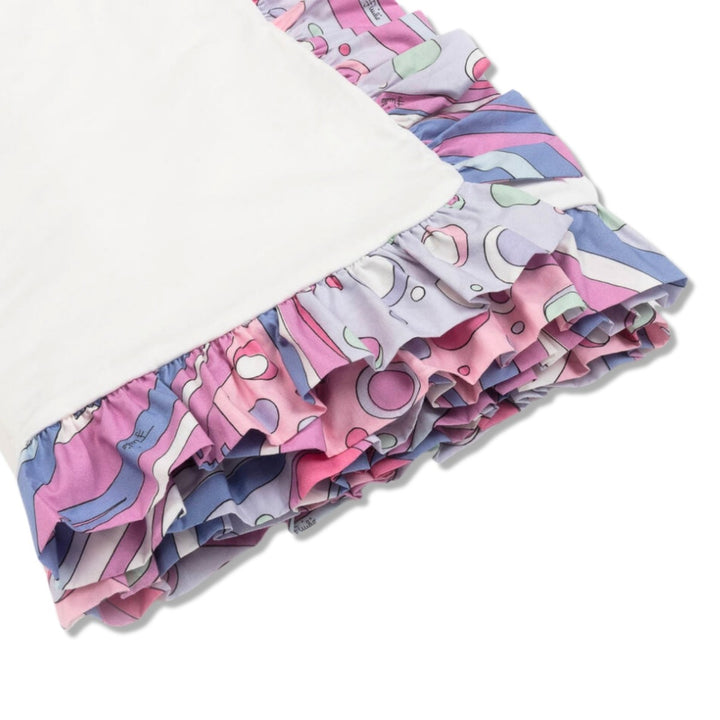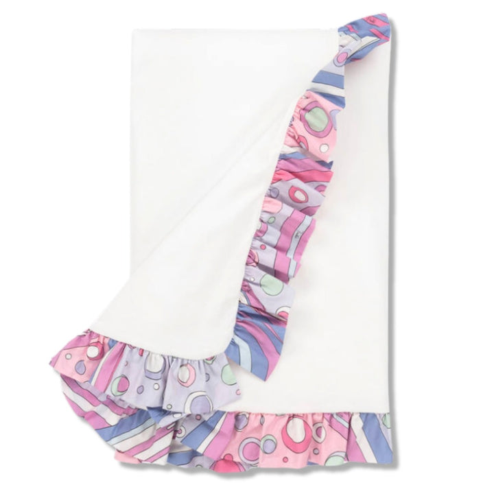 Beautiful white padded blanket for baby girls by PUCCI, with the Italian designer logo and fish motif embroidered in pink and lilac. Lightly padded for gentle comfort, the blanket is made in super soft cotton jersey. For added designer appeal, it has ruffled poplin trim in the distinctive Fontane print, in shades of pink, lilac, and blue.