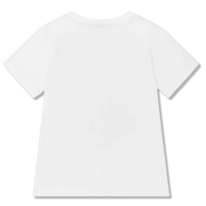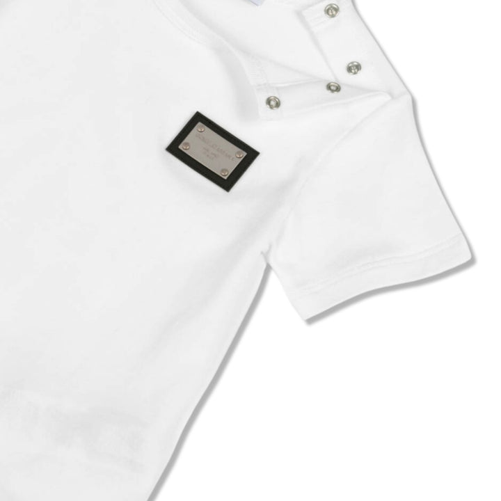 From luxury Italian label Dolce & Gabbana, a classic white T-shirt for little boys and girls. Made in comfortable cotton jersey, it has a logo plaque on the chest for a stylish designer touch. Concealed popper fastenings on one shoulder help with dressing.