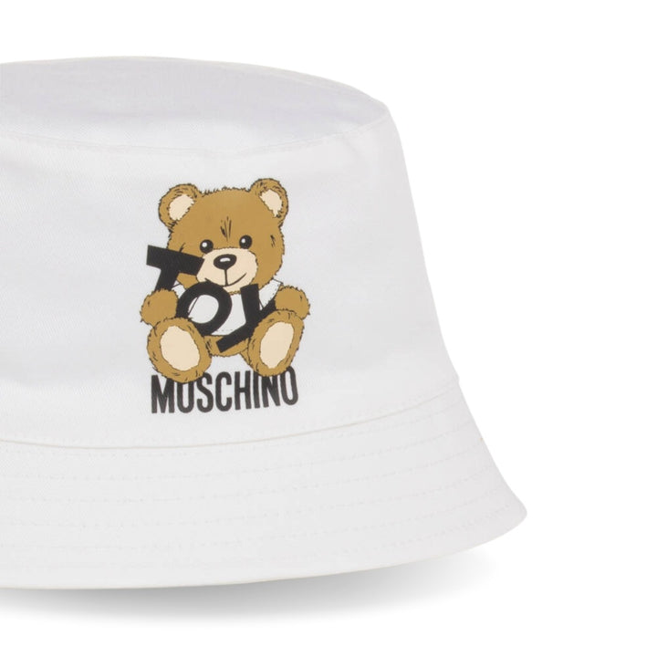 Adorable off-white bucket hat for little boys and girls by Moschino, with the signature Teddy Bear logo on the front. This adorable sun hat is made in luxuriously soft cotton gabardine with a classic, stitched brim and a lightweight lining for comfort.0
