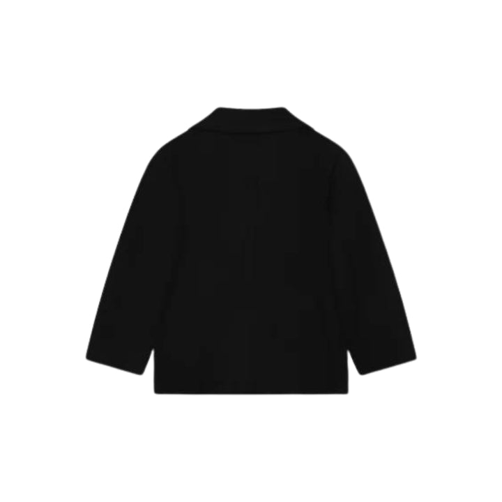 Double-breasted black jacket, with long sleeves, lapel collar, closure with iconic golden buttons. It is embellished with embroidered crest and logo on the chest.
