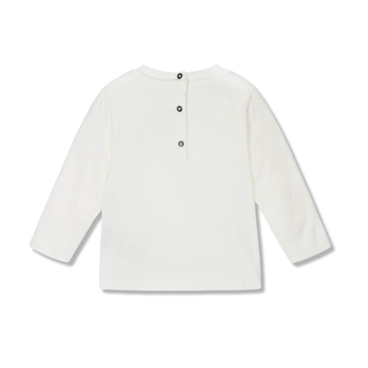Ivory long-sleeved top for baby boys by luxury French label Balmain, made in soft cotton jersey. Ideal for comfortable, casual wear, it has a lightly ribbed crew neckline and poppers on the back to help with dressing. A black logo patch on the chest adds a designer finishing touch.