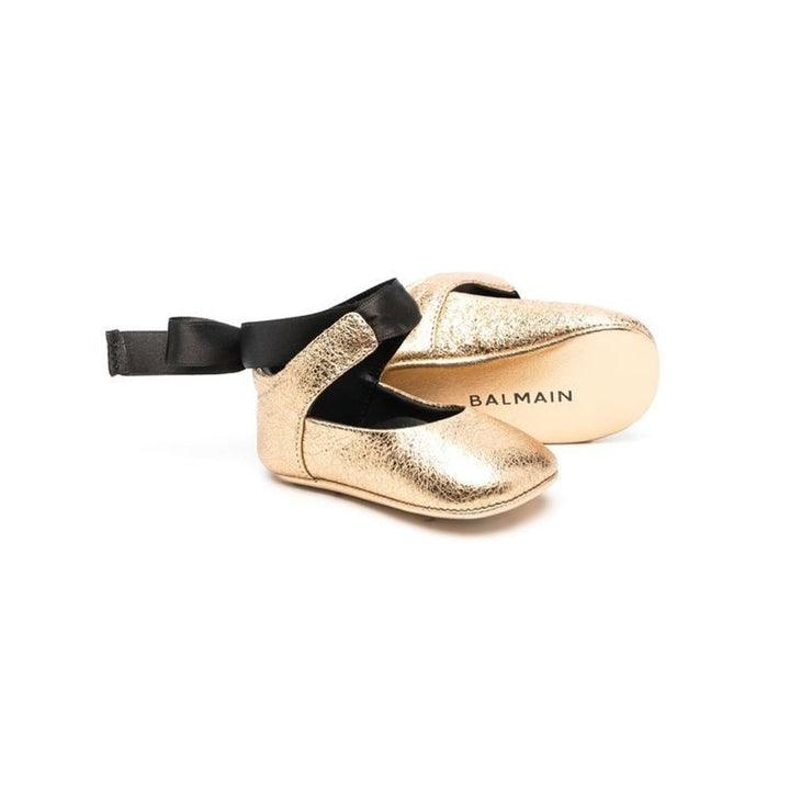 Balmain Paris Ballerina Shoes for baby girls in cute Golden color with glittery finish and ribbon on top for knot.