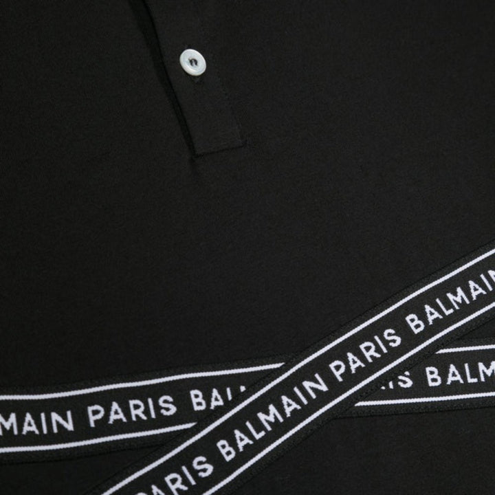 From luxury French label Balmain, a cool and casual Black cotton jersey polo T-shirt for boys. A contemporary take on a classic style, the front has two cross-over black and white elasticated logo tapes for a bold designer statement look. It fastens with smart, branded pearlescent buttons under the collar.
