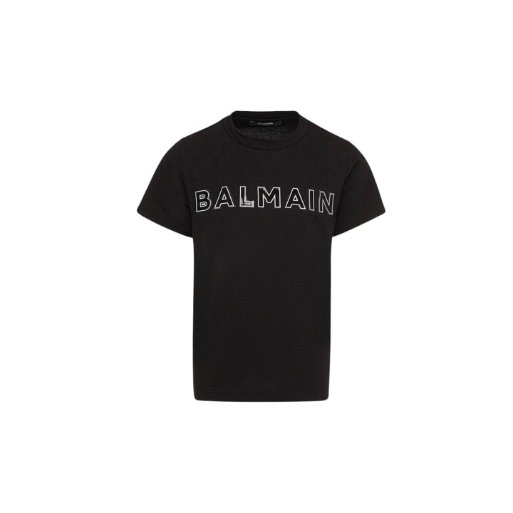 Balmain Kids short-sleeved t-shirt in black cotton with contrasting Balmain logo applied to the front. Regular fit.