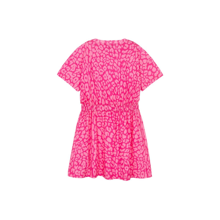 Bright pink leopard print jersey dress for girls by luxury designer, Balmain. This relaxed-fit design has an elasticated, stretchy waistband and is made in soft organic cotton for comfort, with a bold white logo print across the front.