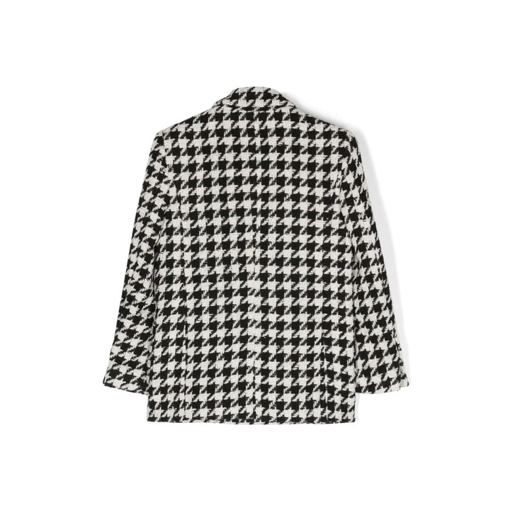 Features - black-white ,houndstooth pattern,knitted construction,notched lapels,double-breasted button fastening,gold-tone buttons,two front patch pockets,logo patch at the chest,long sleeves,buttoned-cuff sleeves,straight hem.