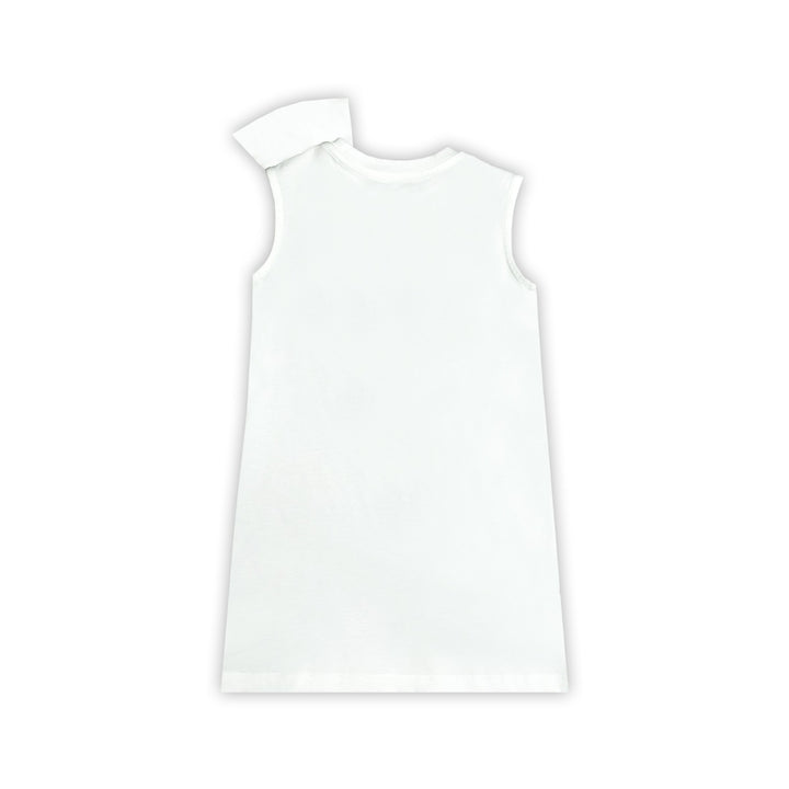 Stylish white dress for girls by luxury French designer, Balmain. Made in soft cotton jersey, this chic, sleeveless design has a statement bow on one shoulder. On the hem, there is a black Balmain Paris logo printed for monochromatic, branded appeal.