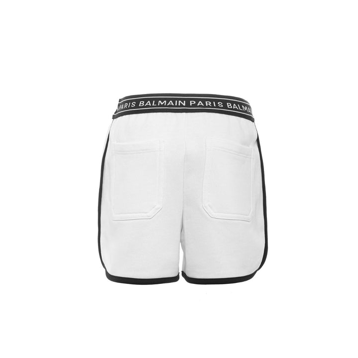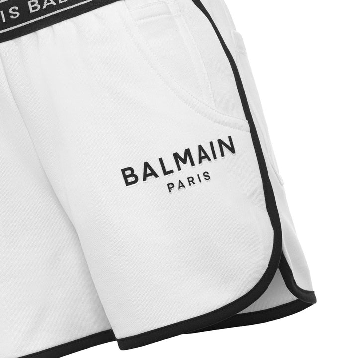 Sporty white shorts for girls by luxury French fashion house Balmain. Made in mid-weight organic cotton sweatshirt jersey, they have a flocked black and silver 3D Paris logo on one side, with black trims and an elasticated, logo stripe waistband. On the front there are jetted front pockets with coin pockets above and patch pockets around the back.