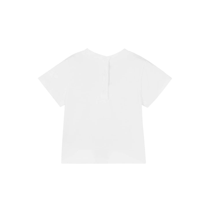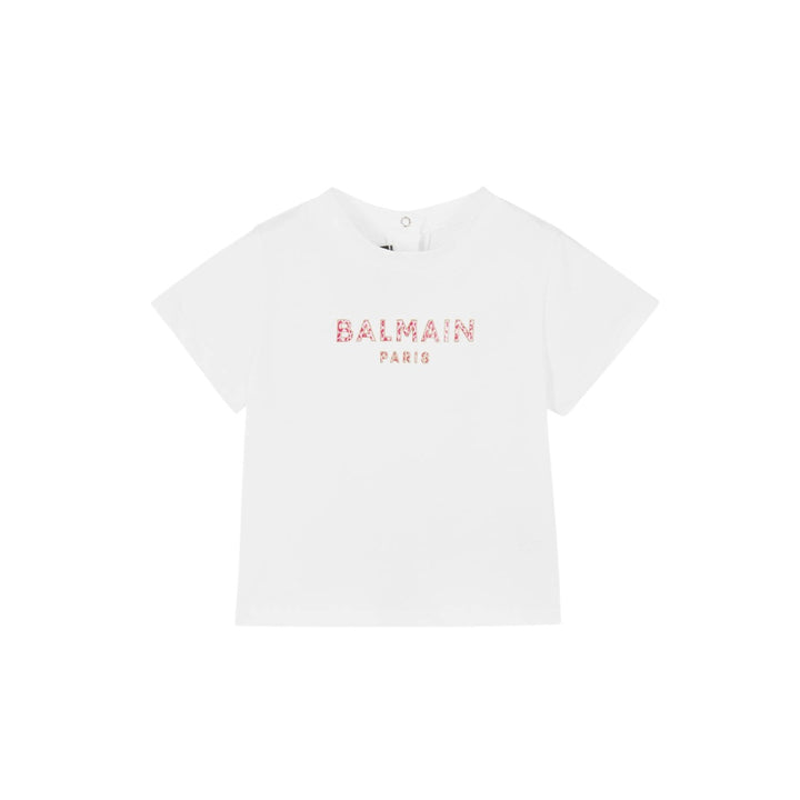White cotton T-shirt for little girls from luxury designer Balmain. It is made in soft and lightweight jersey, with the French labels Balmain Paris logo stamped on the front in pink leopard print with gold outlines. This crew neck top has short sleeves and tonal white branded poppers on the back for quick and easy dressing.