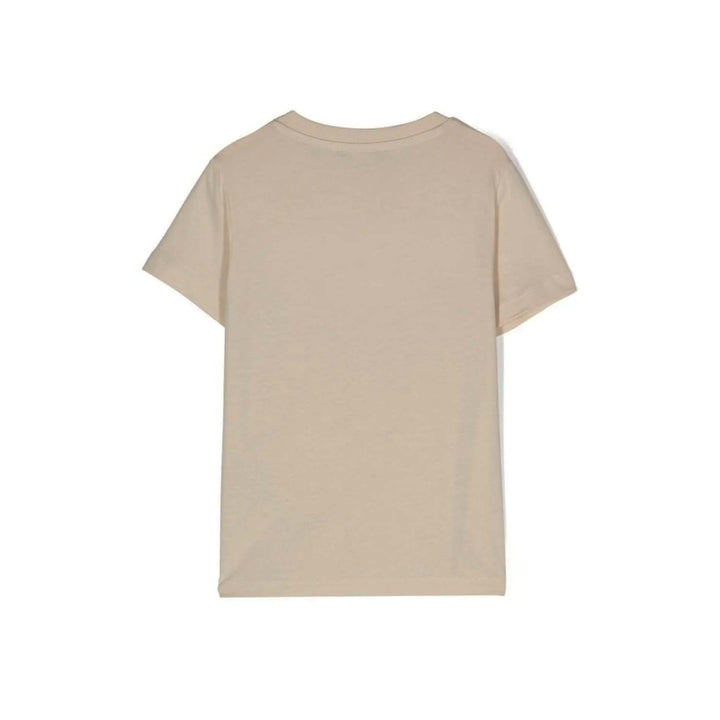 Casual, cool and distinctly designer, this beige, short-sleeved T-shirt for boys and girls is by French luxury label Balmain. Made in soft cotton jersey for easy-to-wear comfort, it has a signature beige logo embroidered on the chest. Doubling up as useful popper fastenings, the iconic gold medallion poppers sit on one shoulder for added branded appeal.