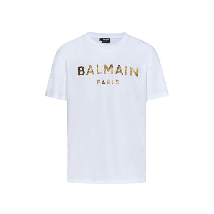 White cotton T-shirt for boys & girls from luxury French designer, Balmain. It has a shiny gold foil logo print on the front. Made in soft and stretchy jersey, it provides all-day style and comfort.