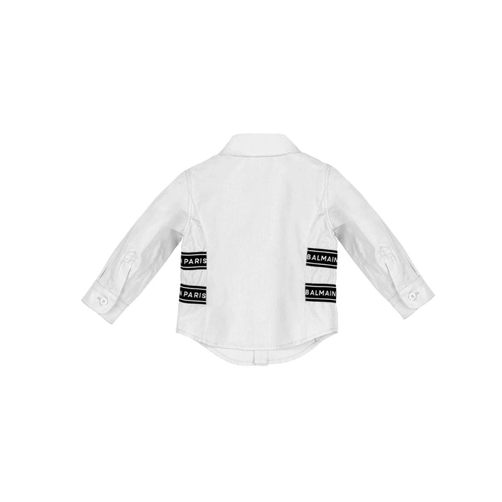 Balmain kids logo-stripe long-sleeve shirt from Balmain Kids featuring white/black, cotton, logo print to the side, classic collar, front button fastening, long sleeves and curved hem.\