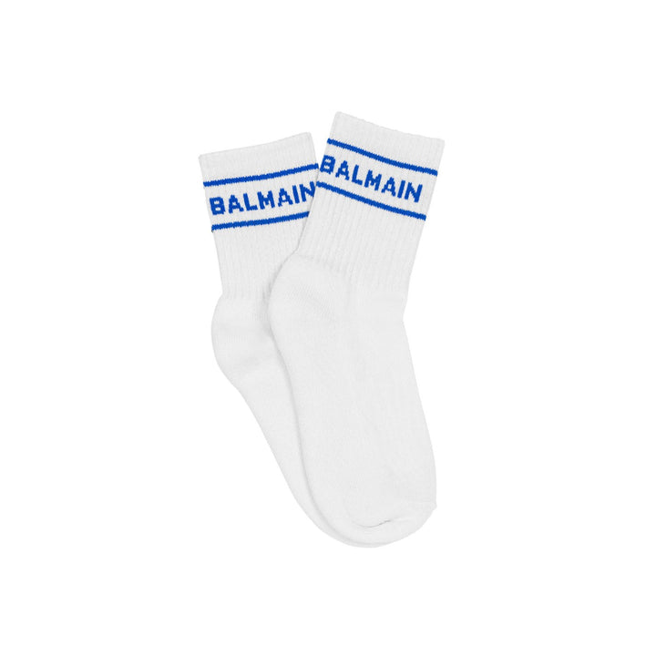 White socks from Balmain Kids. Made of cotton, this pair features a blue logo embroidery and ribbed cuffs.
