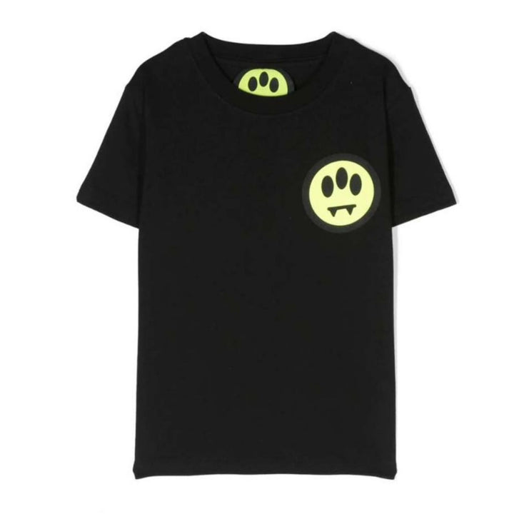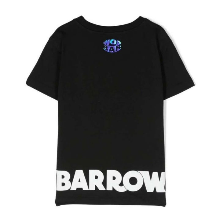 Black cotton logo print tshirt with a front graphic print to the rear crew neck and graphic print at the back with short sleeves straight hem.