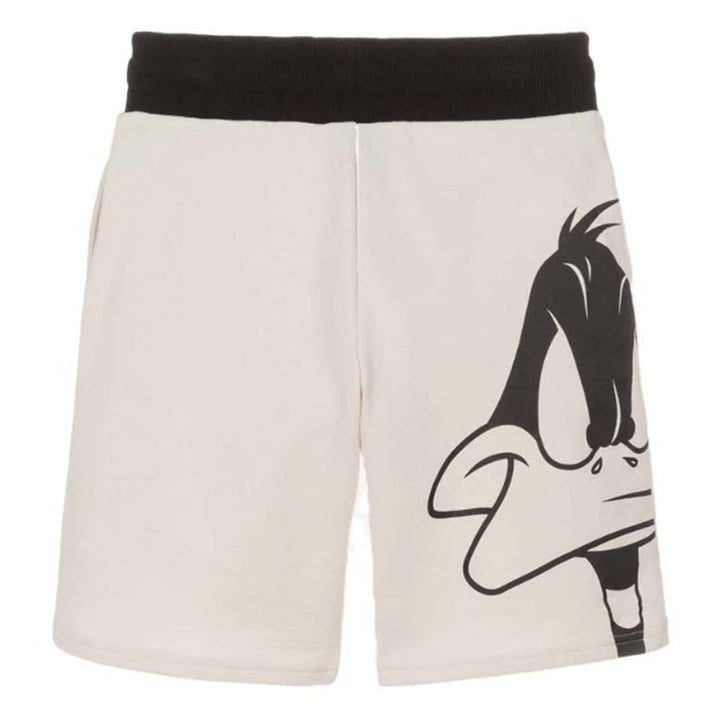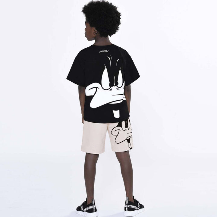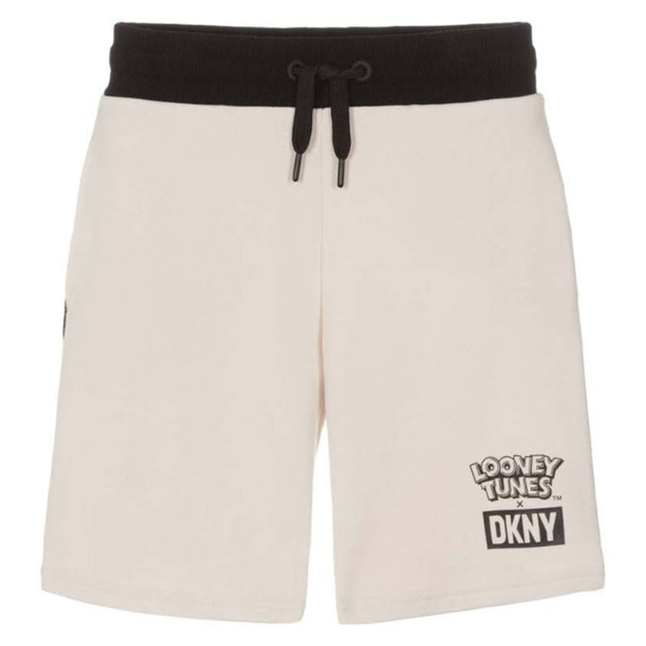 Cartoon-inspired light beige shorts for boys and girls, with Looney Tunes x DKNY printed on one leg to mark the collaboration. There is an oversized Daffy Duck character printed on the back for a cool, graphic look. Comfortable for everyday casual an