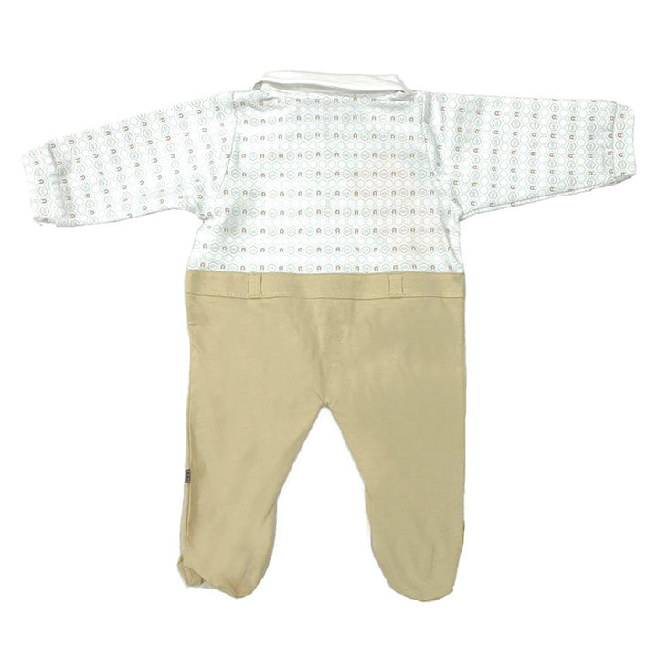 Beige babygrow for boys by luxury German brand AIGNER, made in super soft, comfortable Pima cotton jersey. The babygrow has a half hem print of brand A shape horse on white with a small pocket and A shape horse embroidered on it. It has popper faste