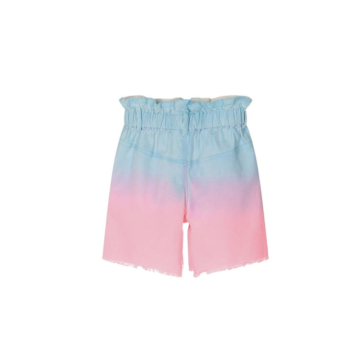 Blue and pink ombre shorts for girls by Billieblush. Made in lightweight twill, they have a comfortable, elasticated waist with useful belt loops and jetted side pockets. They fasten with a glittery pink popper and zip and have fun distressed hems.