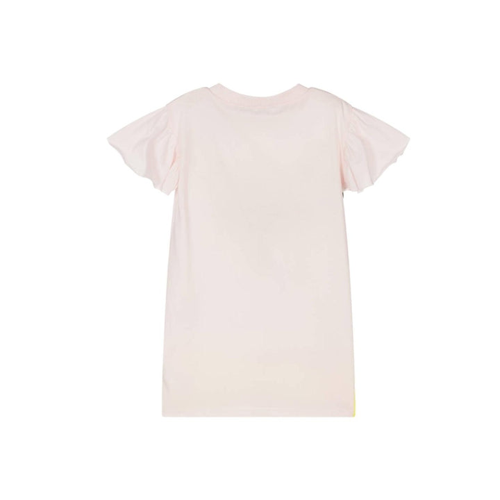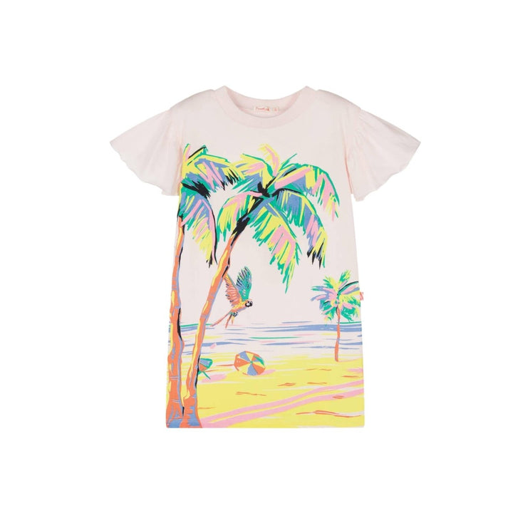 Girls light pink T-shirt dress with a tropical edge, by designer Billieblush. Made in the softest cotton jersey, it has a colourful palm tree and beach themed design in vibrant neon shades and pretty frilled sleeves for a cute yet relaxed look.