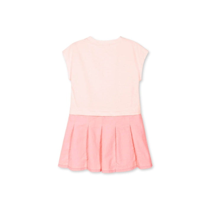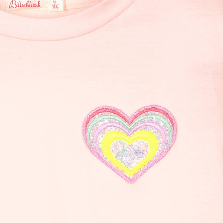 A playful pink T-shirt dress for girls by Billieblush, with a soft cotton jersey top and a flowy pleated skirt. Fun to wear on casual days, it has a glittery colourful love heart badge decorated on the chest for a sparkly look.