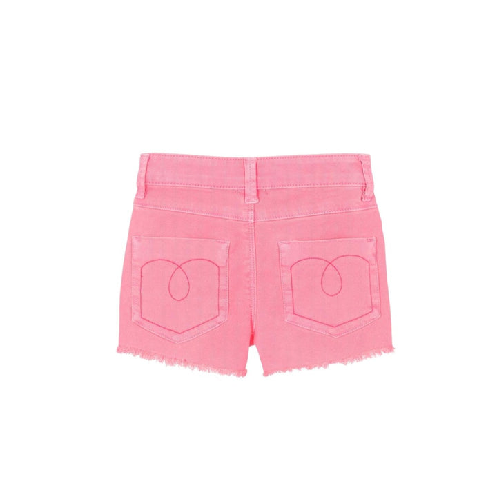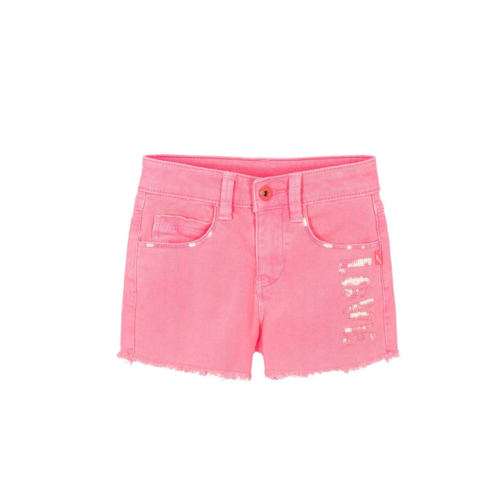 Add a pop of colour to any outfit in these neon pink shorts for girls, by designer Billieblush. Made in soft cotton denim, they have a glittery button fastening with a gold zip, a sequined LOVE slogan and the brands iconic logo tab on the front. For a cool, girly look, they have classic five pocket styling with sequin trims on the front, and heart-shaped neon pink stitching on the back. There is a useful adjustable waistband and on trend frayed hems.