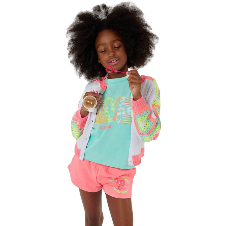 In bright neon pink, these fun jersey shorts for girls are by Billieblush. One side has a shiny sequinned heart, together with a colourful slogan print which says 'ice cream solves everything'. Made in a soft cotton-blend, the shorts have comfortable elasticated waist and concealed side seam pockets.